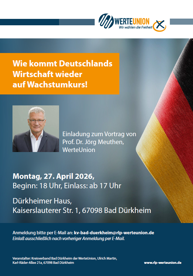 Der Kreisverband Bad Dürkheim der WerteUnion lädt am Montag, 27. April 2026, zu einem öffentlichen Vortrag ein. Referent ist Prof. Dr. Jörg Meuthen, Mitglied der WerteUnion, der sich mit einem der drängendsten Themen der deutschen Gegenwart befasst: der wirtschaftlichen Wettbewerbsfähigkeit Deutschlands.